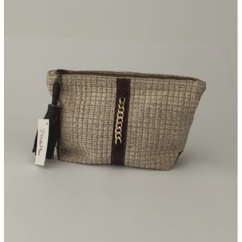 Cartera solidaria en tejido beige y borla en piel marrón oscuro.