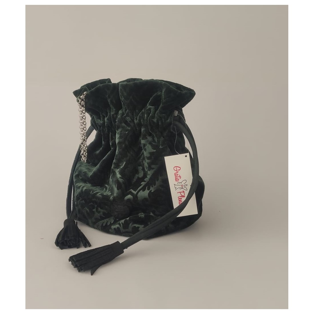 Bolso solidario saco pequeño confeccionado en brocado verde botella, con acabados en piel negra y bandolera en cadena plateada