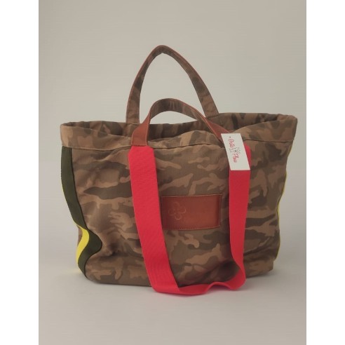 Bolso shopping en tejido camuflaje con asas de mano en cuero Camel y asas de hombro en cintas color rojo