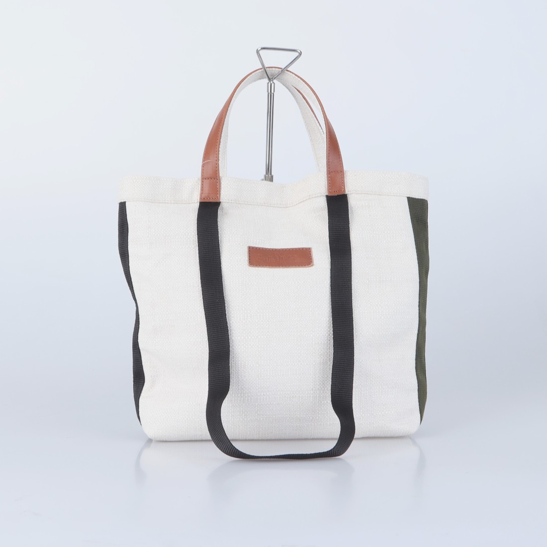 Bolso de lona de algodón blanco roto con cintas de nylon en verde oliva y rojo.
