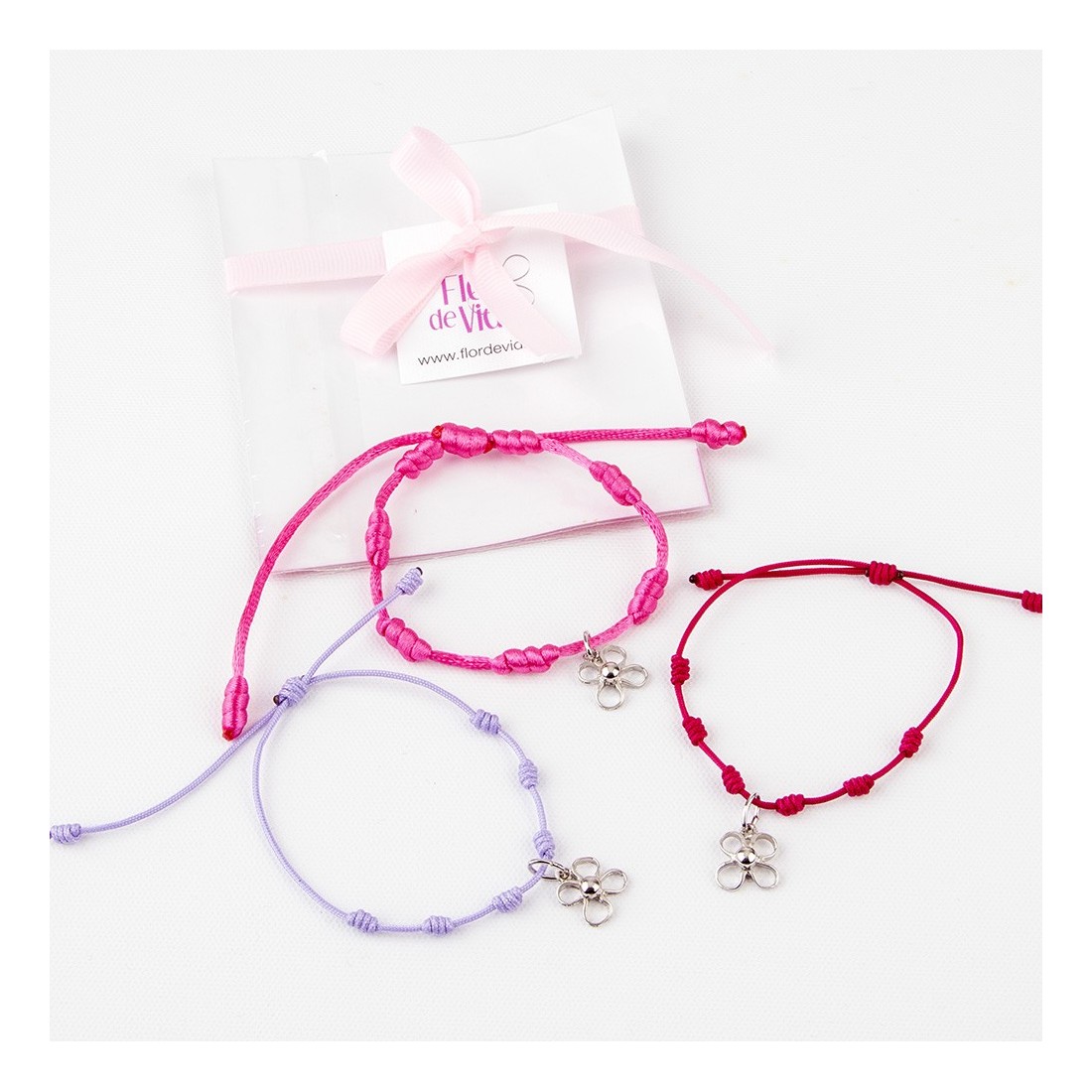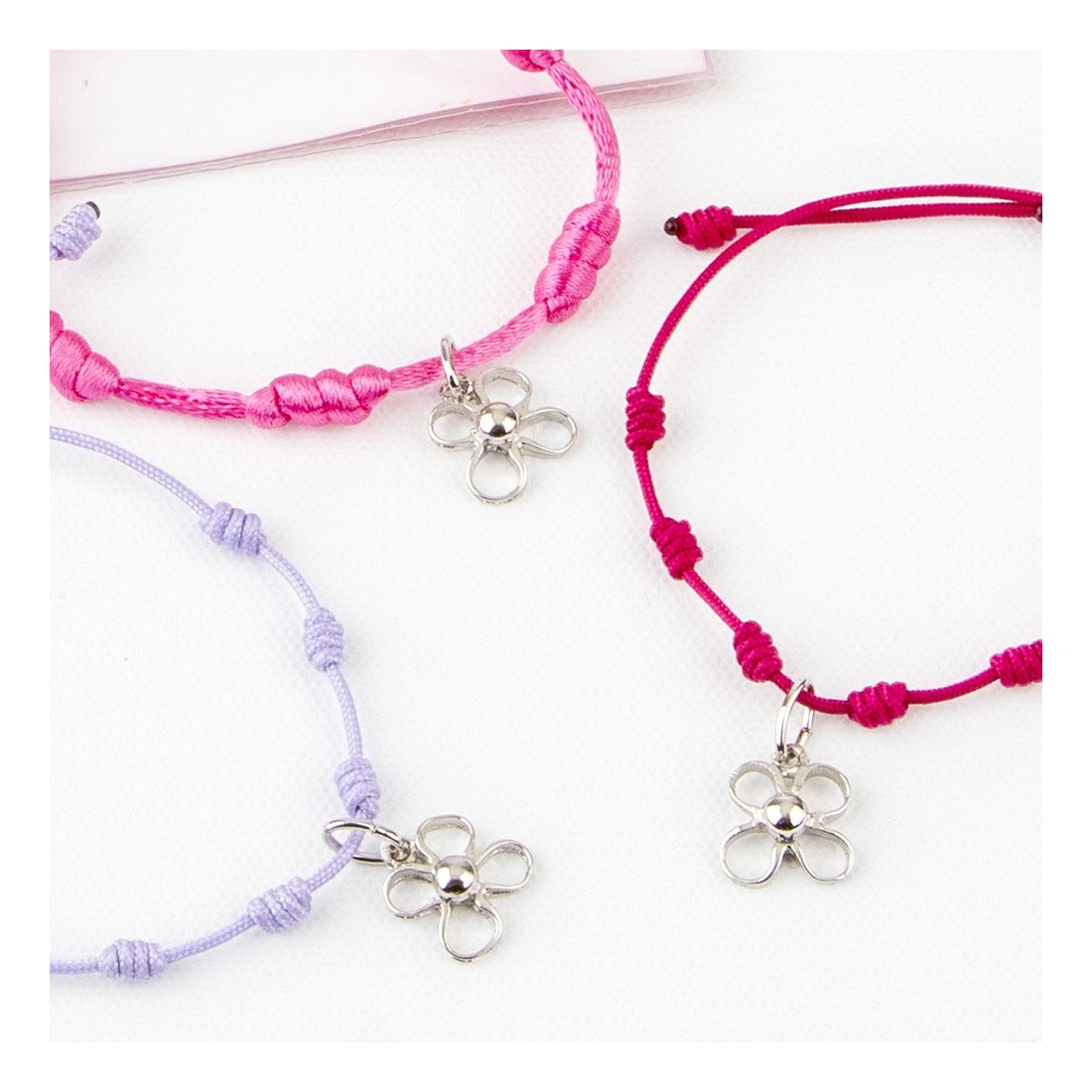 Pulsera de macramé con hilo de nylon o cordón de seda con flor de metal con baño de plata 925mm.